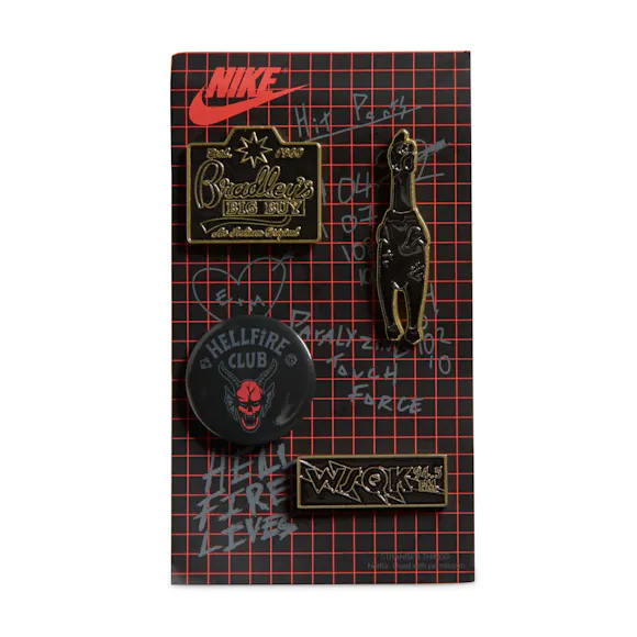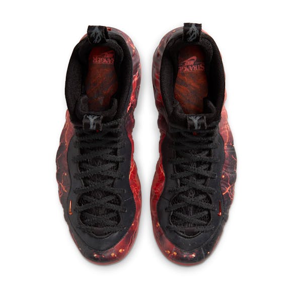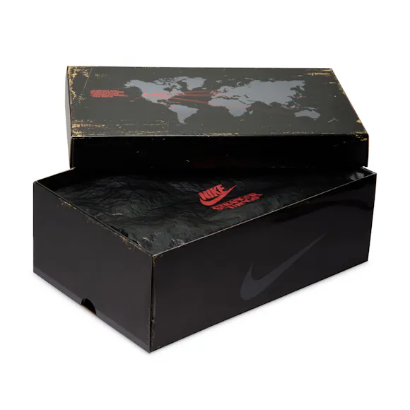This shoe contains many details related to the fifth and final season of Stranger Things. We imagine you found the upside down logos. Maybe it isn't about what you have discovered though, but what happens when, after so much searching, Vecna has finally found you. Foamposite upper molds to your foot for a glove-like fit. Heel and full-length Air Zoom cushioning provides bouncy, lightweight comfort. Glow-in-the-dark rubber outsole with herringbone tread adds durable traction.
