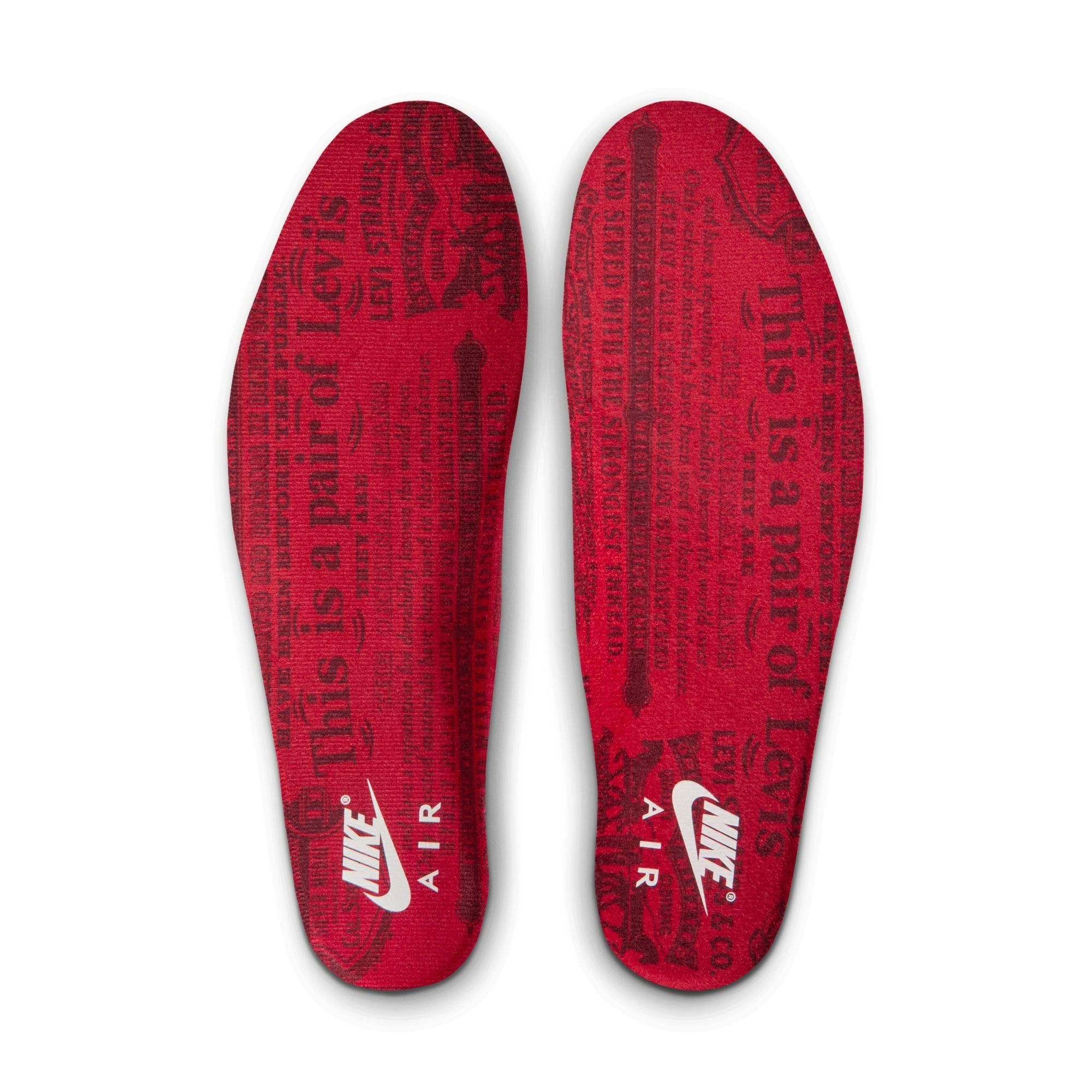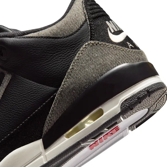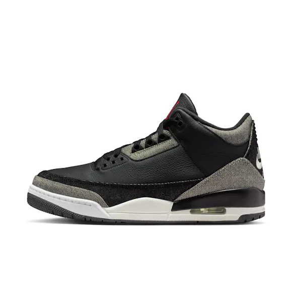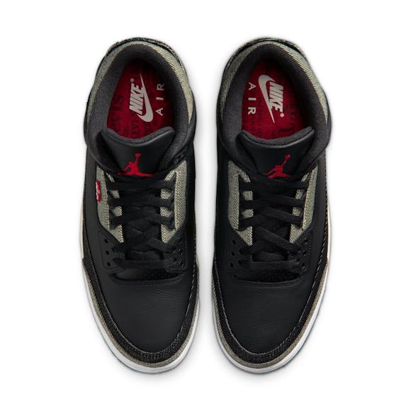 Jordan and Levi’s® reunite to deliver a fresh spin on the AJ3. Reverse black denim pairs with matte premium leather on the upper for a sleek dark wash look. The iconic red tab at the eyelets matches Gym Red details on the outsole and sockliner, while Levi’s®’ signature dollar bill graphic completes the look.