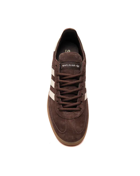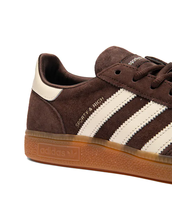 Elevated minimalism meets decades-old heritage in these Adidas Handball Spezial shoes, made in collaboration with style curators Sporty & Rich. With a vintage-inspired feel, they feature a smooth leather upper, rubber outsole, and textile lining for a retro aesthetic that's simple and sophisticated. Wear them for any occasion — they're just that versatile.